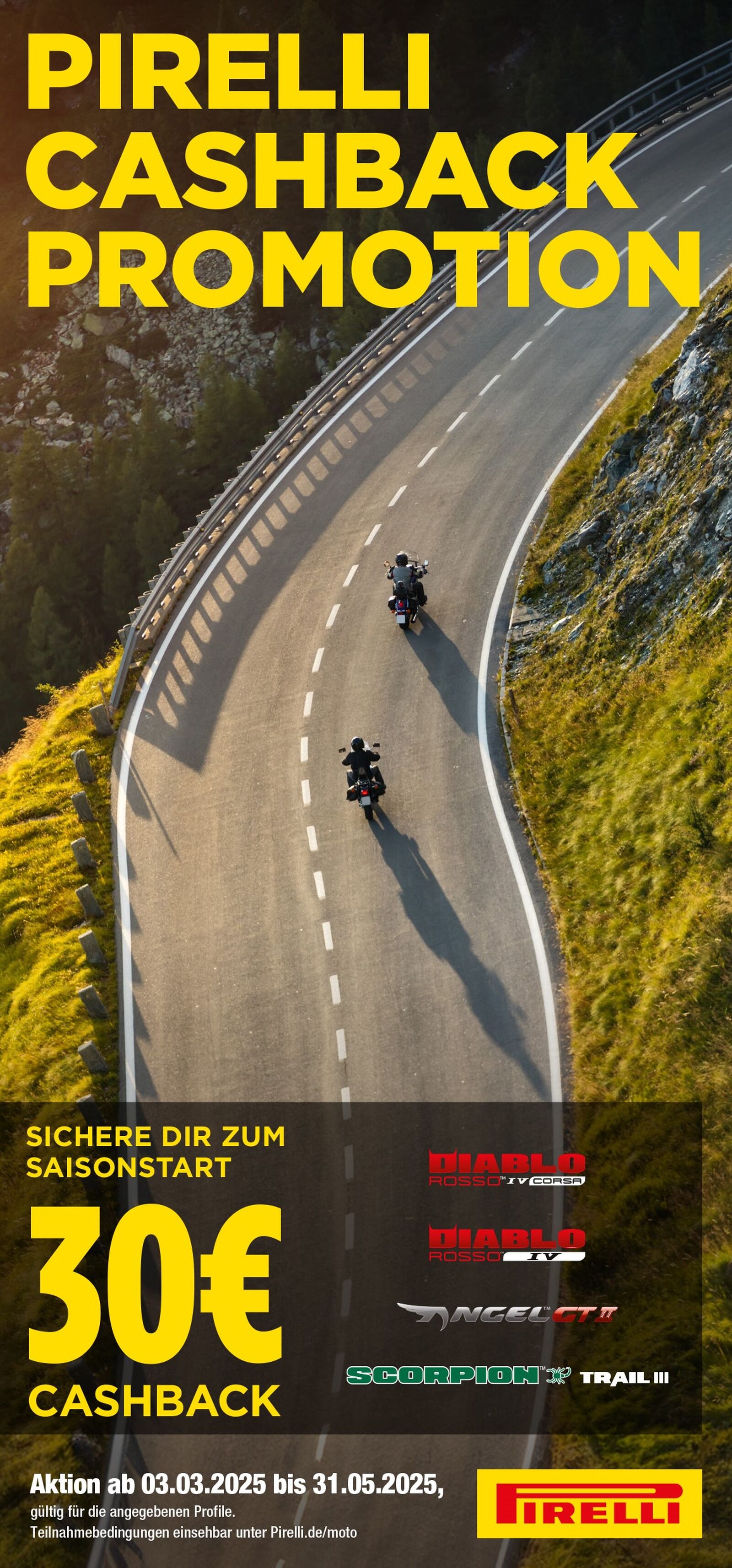 Mailand (Italien), 12. März 2025 – Der Frühling beginnt, und damit erklingt auch der Startschuss für die diesjährige Motorradsaison. Für viele Fahrer heißt das: Ein frischer Satz Reifen muss her, um das Beste aus den anstehenden Touren rauszuholen. Wer also kurz vor dem Reifenupdate steht, dem bietet die neue Promotion zum Saisonstart von Pirelli dazu die optimale Gelegenheit. Alle, die sich bis zum 31. Mai 2025 für einen Satz von vier ausgewählten Modellen entscheiden, können satte 30 Euro Cashback einheimsen. Ein ideales Plus für die Proviantkasse auf der ersten Tour!