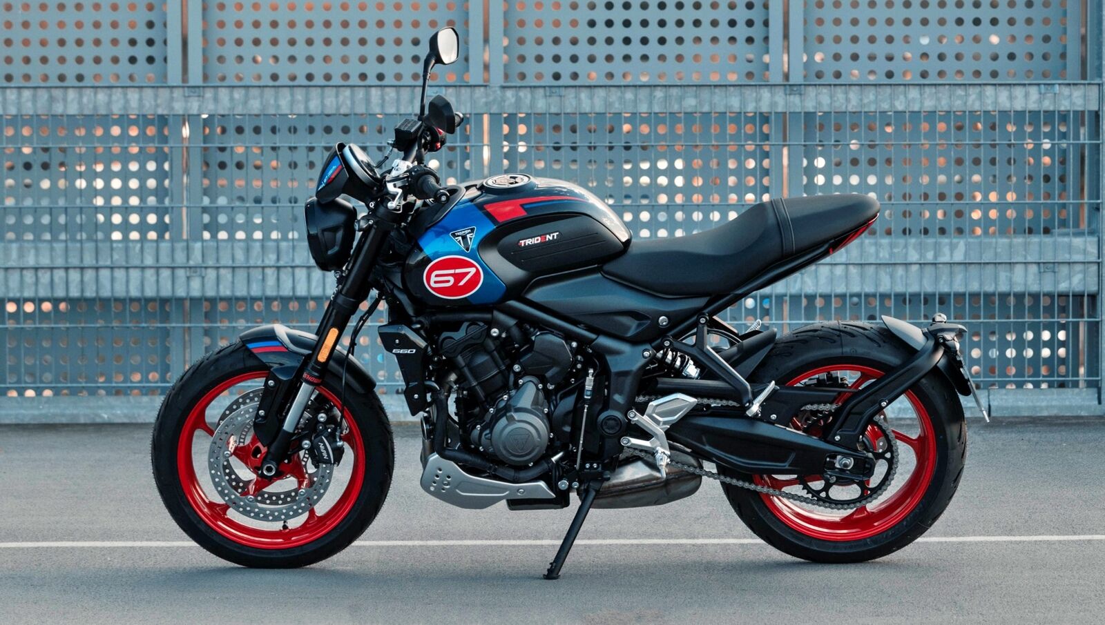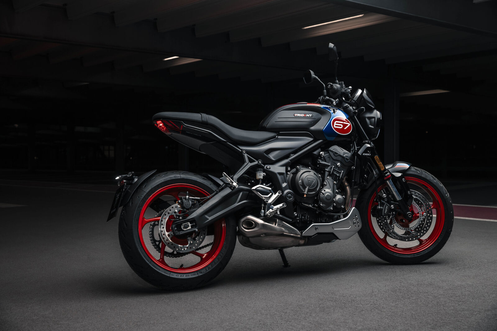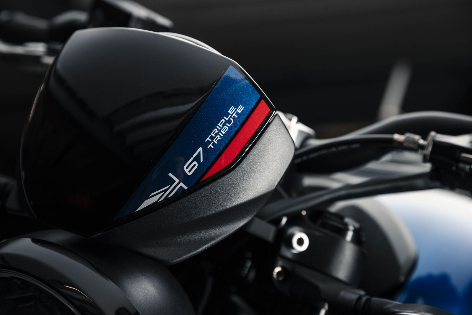 Die Special Edition behält ihr vom Rennsport inspiriertes Aussehen bei und ist eine Hommage an TRIUMPHs legendäres Rennbike „Slippery Sam", mit dem die Marke fünf Mal die TT auf der Isle of Man gewann. Als moderne Hommage an diese Erfolge – und im Kontrast zum letztjährigen Sondermodell – ist das Design des neuen Bikes in glänzendem Sapphire Black gehalten. Im Kontrast dazu stehen die auffälligen Farbakzente in Cobalt Blue und Diablo Red, die sich über den Tank und die Frontpartie ziehen. Mit der Zahl „67" auf dem Tank – der Startnummer von „Slippery Sam" – schlägt TRIUMPH die Brücke zur berühmtesten Trident der Firmengeschichte.
