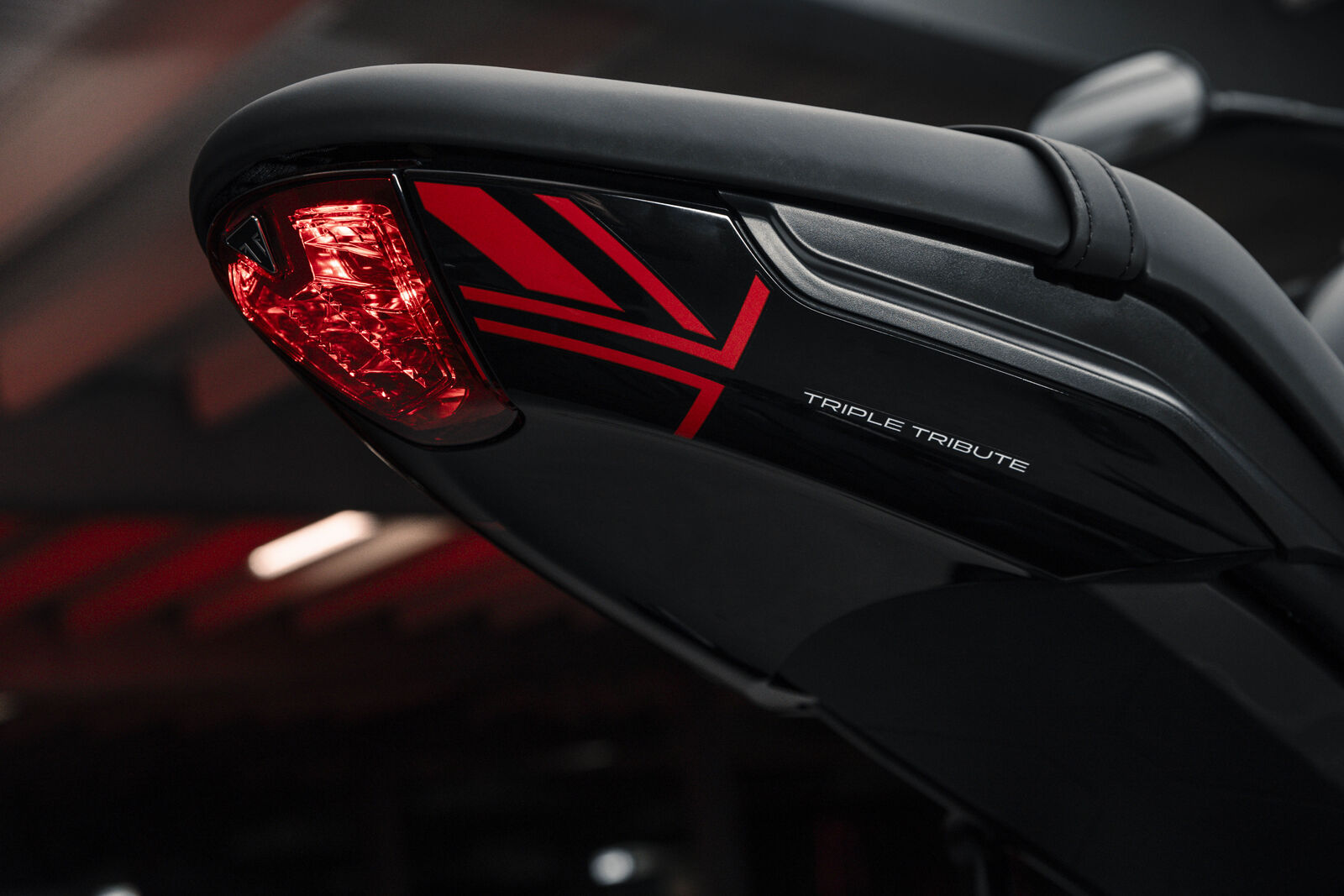 Die Felgen in Diablo Red verleihen der neuen Special Edition eine unverwechselbare Präsenz, während die Fly Screen in Sapphire Black mit passenden Triple Tribute-Grafikdetails die Frontsilhouette unterstreicht. Abgerundet wird der moderne Look durch einen Aluminium-Bugspoiler, der serienmäßig für ein sportliches Profil sorgt. Das auffällige Design knüpft an die Rennsporttradition von TRIUMPH an und gibt der Trident Triple Tribute einen unverwechslbaren Charakter. Wie bei der letztjährigen Serie gilt: Wer dieses spezielle Motorrad haben möchte, sollte nicht zu lange warten, denn die neue „TTT" wird nur in begrenzter Stückzahl produziert.