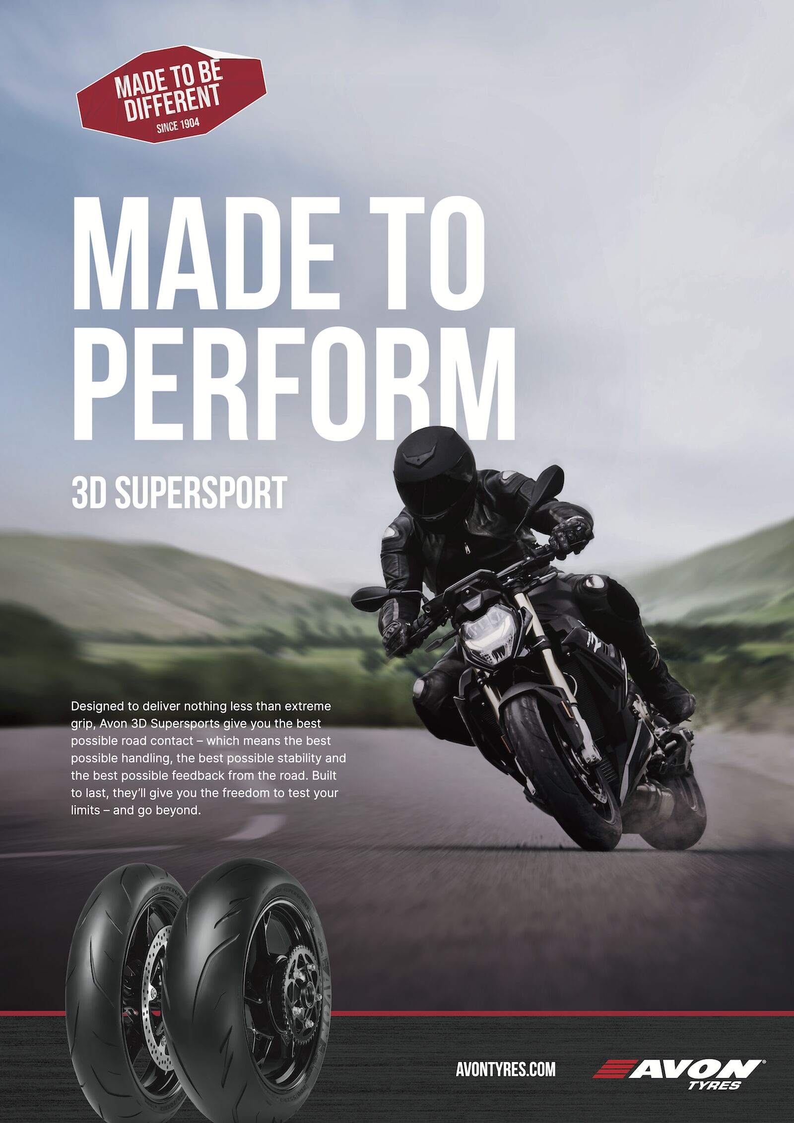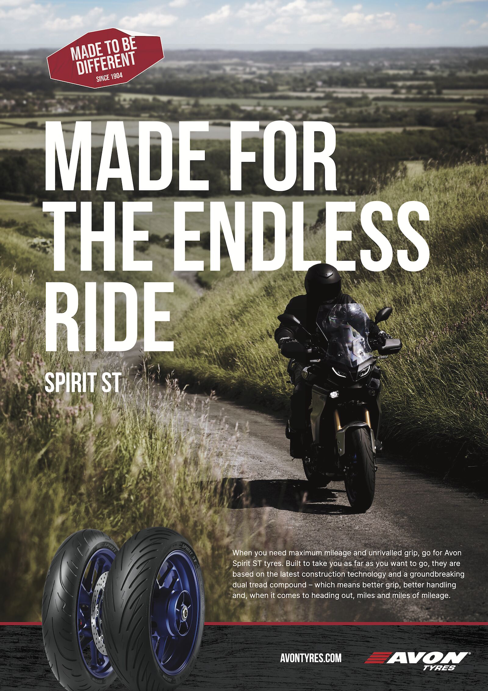 Seit 1904 steht Avon für zuverlässige Performance und Produkte von höchster Qualität zu einem fairen Preis. Als Teil der Goodyear-Familie startet die traditionsreiche Marke nun in eine spannende Zukunft. Avon nutzt sein Erbe, um Reifen zu entwickeln, auf dessen Leistungsversprechen Sie sich verlassen können - bei jeder Ausfahrt, egal ob auf einem Custom-Bike, einer Touring-Maschine oder einem Superbike. Avon. Made to be different.