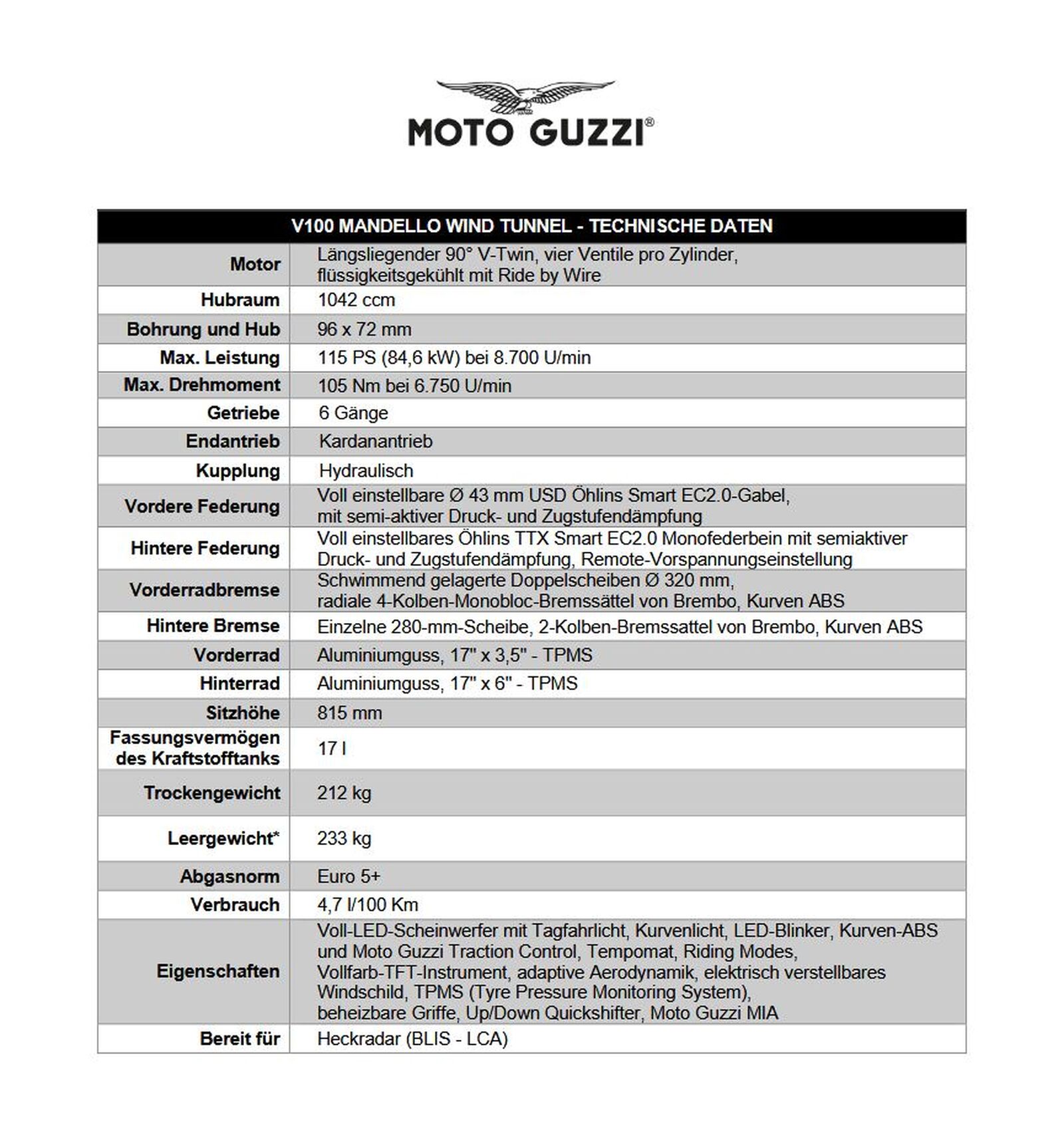 Die Sonderedition Windtunnel bietet serienmäßig eine umfassende technische Ausstattung, darunter die semiaktive Öhlins Smart EC 2.0-Federung, eine Trägheitsplattform, Kurven-ABS und einen Up/Down Quick-Shifter sowie die Moto Guzzi MIA-Multimedia-Plattform, einen TPMS-Reifendrucksensor und Heizgriffe. Die Lackierung ist rot mit schwarzem Heckteil und vorderem Kotflügel, während der Tank von eleganten schwarzen Elementen an der Seite umhüllt und mit goldenen Details eingefasst ist, die den Farbton der Zylinderkopfdeckel des Motors widerspiegeln. Abgerundet wird das Gesamtangebot 2025 durch ein erweitertes Zubehörprogramm, das unter anderem einen neu entwickelten Tankrucksack und einen Kardanwellenschutz umfasst. Das Blind Spot Information System (BLIS) und auch die Lane Change Assist (LCA)-Funktion sind als Zubehör für die V100 Mandello und die V100 Mandello Windtunnel erhältlich. Bei der S-Version sind diese serienmäßig verbaut. Das System umfasst darüber hinaus Rückspiegel mit integrierten LED-Lichtern, die aufleuchten, um vor potenziellen Gefahren zu warnen.