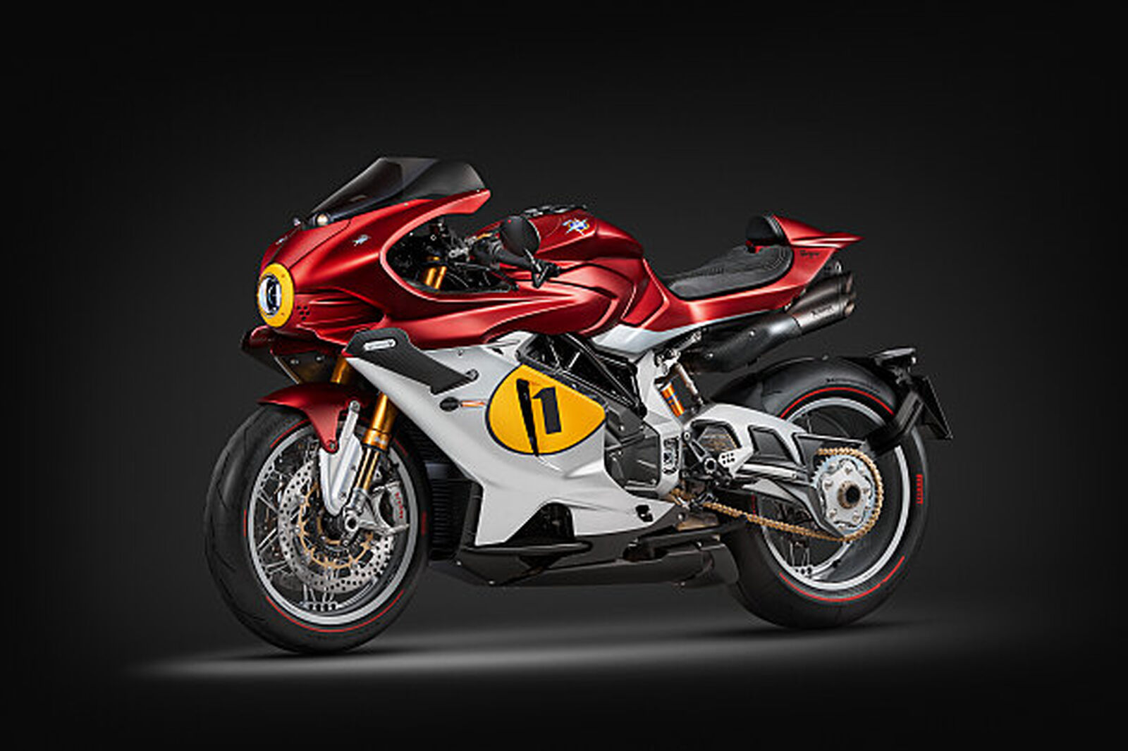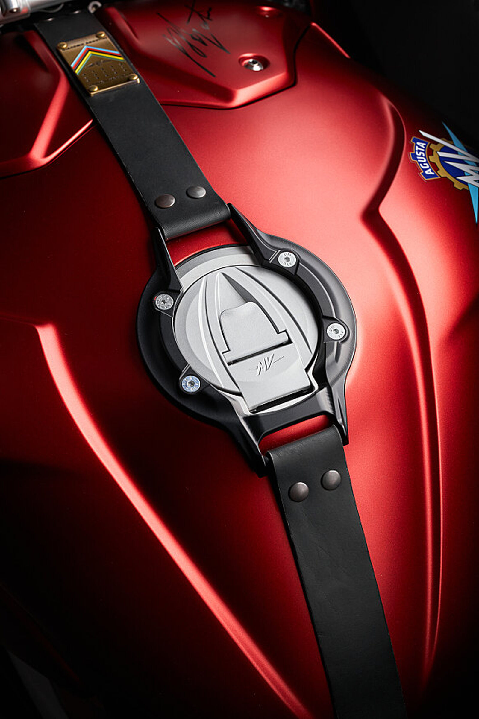 Die Superveloce 1000 Ago ist MV Agustas Hommage an Ago und erscheint 2025, im Jahr des 80-jährigen Markenjubiläums. In den acht Jahrzehnten, in denen sich MV Agusta zur exklusivsten Motorradmarke der Welt entwickelt hat, war Giacomo Agostini zweifellos der wichtigste Name, der mit ihr verbunden ist. Zur Feier von Agostinis 83. Geburtstag im Jahr 2025 bringt MV Agusta die Superveloce 1000 Ago heraus – eine limitierte Auflage von nur 83 Einheiten weltweit. Jedes Motorrad ist persönlich von Agostini signiert und, wie alle Limited Editions von MV Agusta, einzeln nummeriert von 1 bis 83, auf einer echten Goldplakette am Steuerkopf. Jede Einheit wird von einem Echtheitszertifikat mit derselben Nummer begleitet. Die Superveloce 1000 Ago verfügt über ein bisher einzigartiges Detail für ein Serienmotorrad: Ein Teil jedes Motorrads wird aus einem von Giacomo Agostini gewonnenen Pokal gefertigt. Das Gehäuse des Zündschlüssels besteht aus zwei in auffälligem Rot eloxierten Schalen, die aus einem Aluminiumblock gefräst wurden. In einer der Schalen sitzt eine Messingmünze. Sie wurde aus dem Material eines Pokals geformt, den Giacomo Agostini gewonnen hat. Ago selbst wählte den Pokal aus seiner Sammlung aus und schenkte ihn MV Agusta, wodurch die Marke ihren Kunden mit der Superveloce 1000 Ago ein echtes Stück Rennsportgeschichte bieten kann.