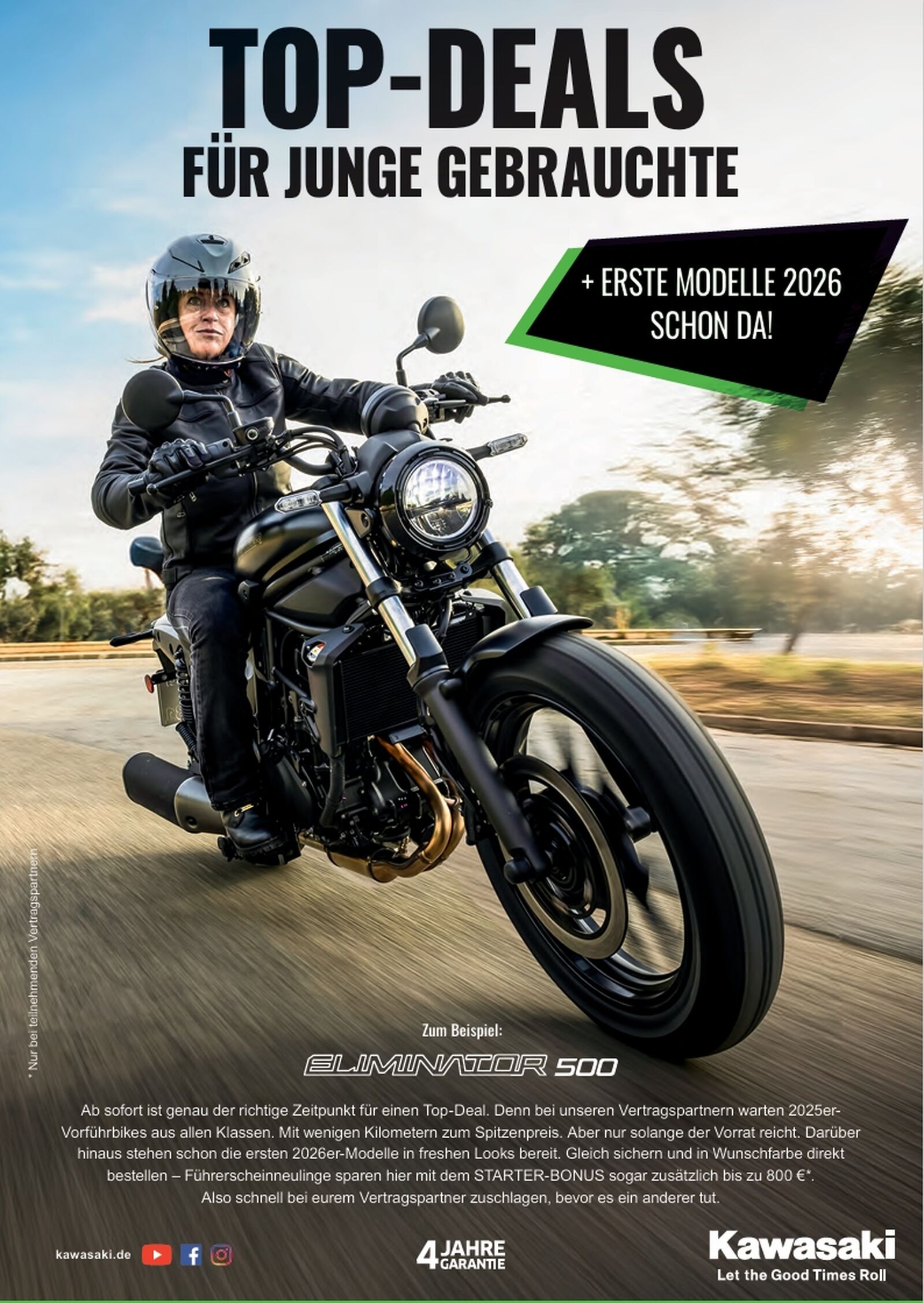 Junge Gebrauchte zu Spitzenpreisen: Beliebte Ex-Vorführbikes aus allen Klassen, wie etwa die Eliminator 500, stehen zu besonders attraktiven Konditionen bei den Kawasaki Händlern bereit – jedoch nur, solange der Vorrat reicht. Zusätzlich profitieren Käufer von der Kawasaki 4-Jahres-Garantie, die den jungen Gebrauchtfahrzeugen umfassenden Schutz und zusätzliche Sicherheit bietet.