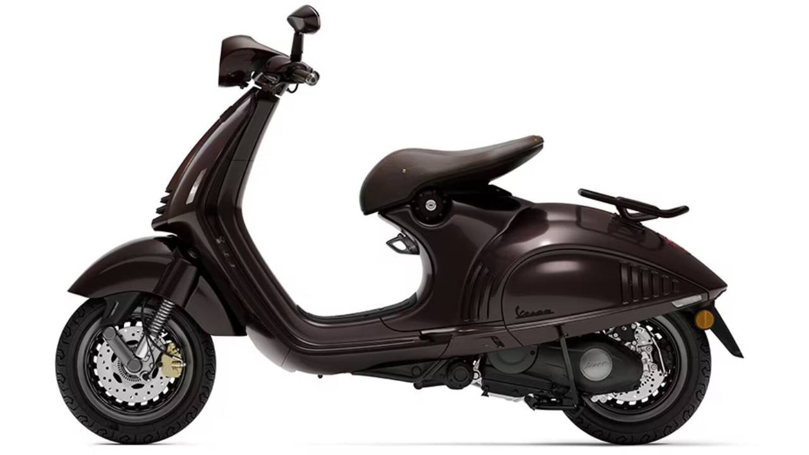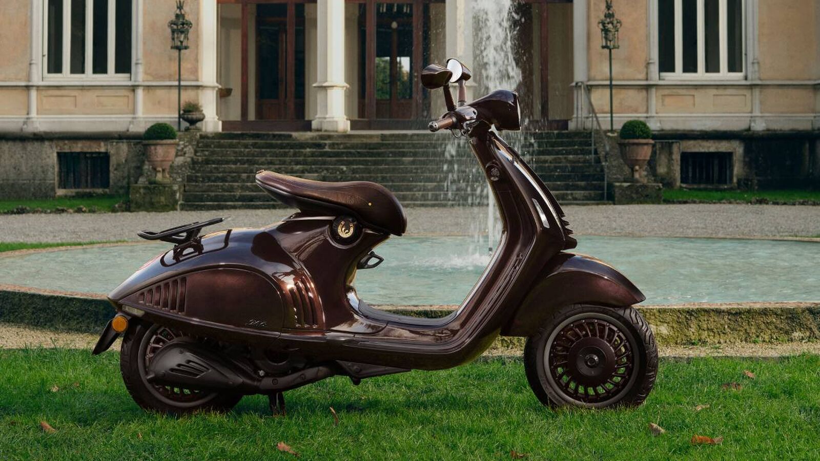 Optisch dominiert die sogenannte Fuchsfarbe, ein tiefer, warmer Braunton, der an das glänzende Fell eines edlen Pferdes erinnert und der Vespa 946 Horse eine außergewöhnliche Präsenz verleiht. Die aus Stahl gefertigte Karosserie spielt bewusst mit Kontrasten aus matten und glänzenden Oberflächen und unterstreicht damit die skulpturale Linienführung des Rollers. Goldene Details setzen gezielte Akzente und verleihen dem Modell einen fast zeremoniellen Charakter. Besonders markant ist das V-Monogramm, das mittig unter dem Sattel in ein Hufeisen eingraviert ist – ein symbolträchtiges Detail, das Glück, Schutz und Tradition vereint. Der Sitz selbst ist ein weiteres Highlight: Inspiriert von klassischen Reitsätteln, wird er von erfahrenen italienischen Sattlermeistern handgefertigt und überzeugt durch hochwertige Materialien und präzise Verarbeitung. Ergänzt wird dieses Ensemble durch edle Lederapplikationen an Lenker und Rückspiegeln, die nicht nur haptisch, sondern auch visuell den Premiumanspruch des Modells unterstreichen. In ihrer Gesamtheit wirkt die Vespa 946 Horse wie ein fahrbares Kunstobjekt, das Design, Materialqualität und Symbolik auf höchstem Niveau zusammenführt.