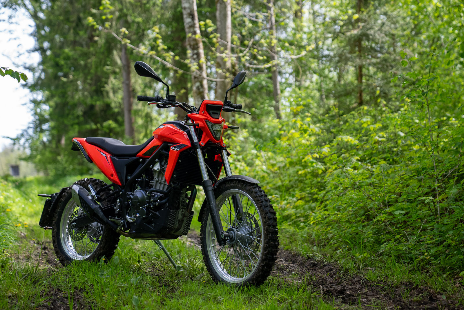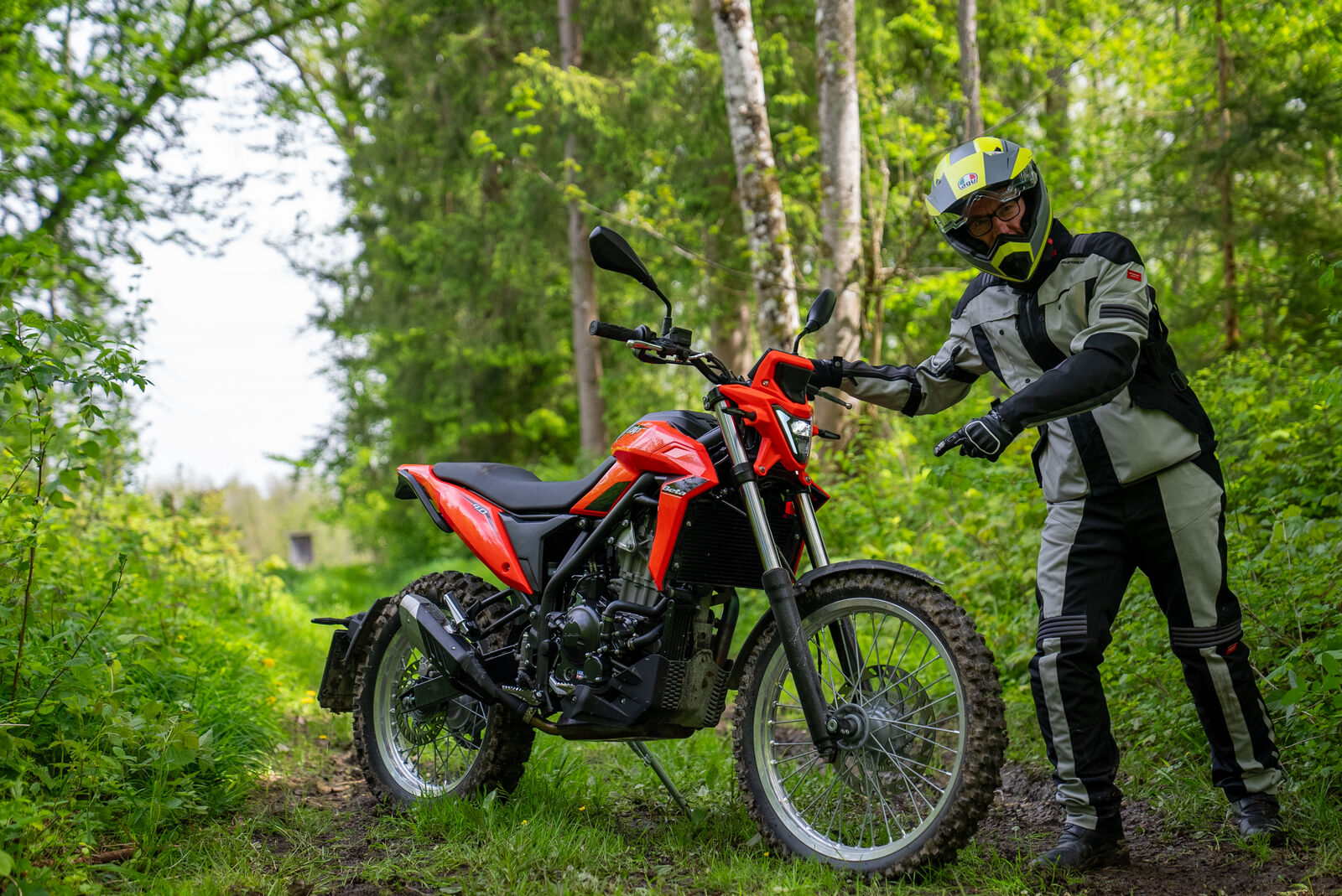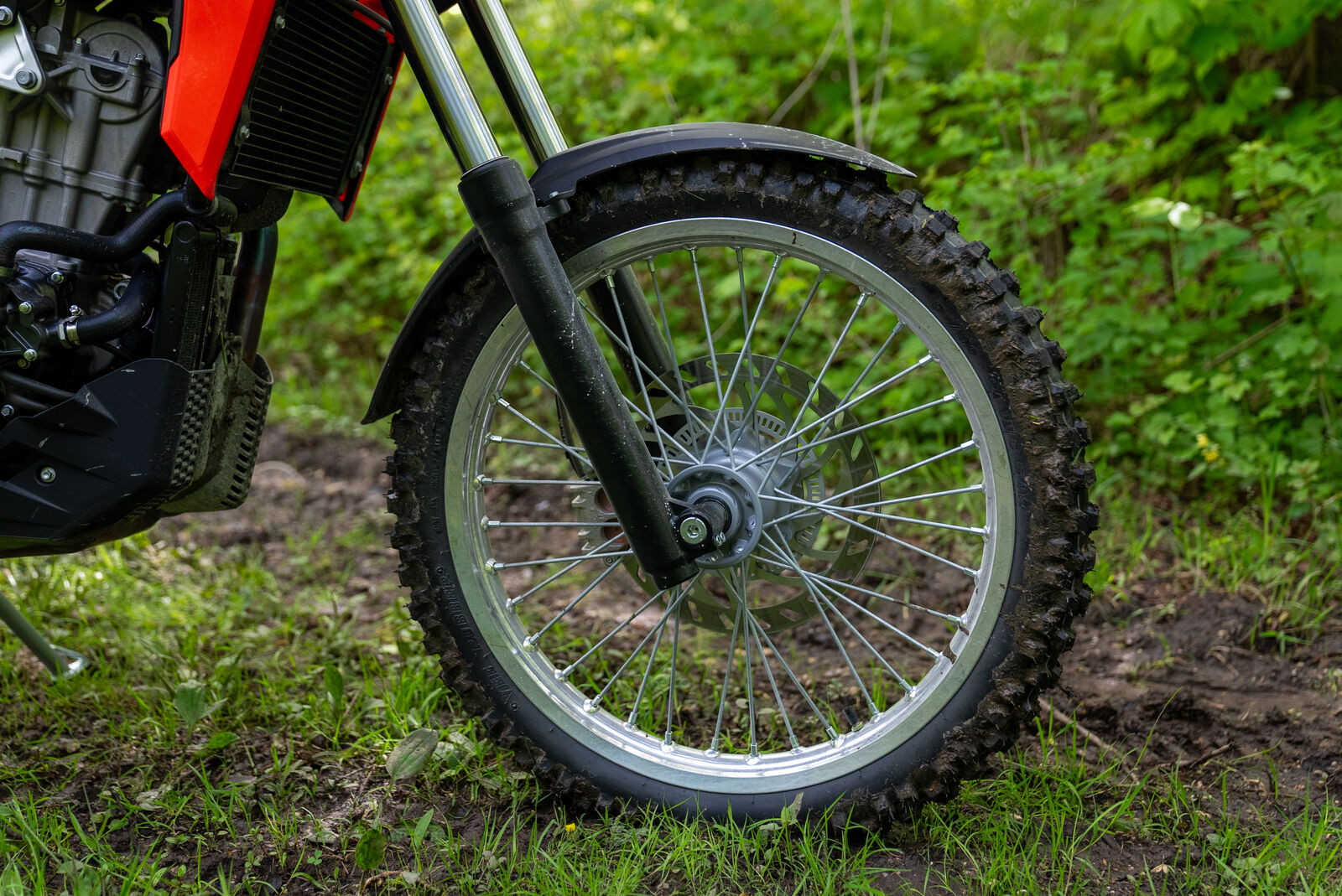 Natürlich darf man nicht erwarten, dass der kleine Motor ein Kraftprotz ist. Man sollte die Alp auch nicht mit einer Sportenduro verwechseln. Aber ab 4.000 Touren legt der Motor richtig los und man kommt überall rauf und runter. In der Originalausstattung sind Reifen von VR Rubber montiert. Die Dimension vorne mit 90/90 und hinten 140/80 ist ein Standardmaß für Enduros, sodass man aus einer Vielzahl von Reifen wählen kann. Für mich hat die Kombination mit einem Reifendruck vorne von 1,5 Bar und hinten 1,7 Bar sehr gut gepasst. Ich hatte sowohl auf Schotter den richtigen Grip und bin auch sehr gut durch die Kurven gekommen, ohne viel zu rutschen.