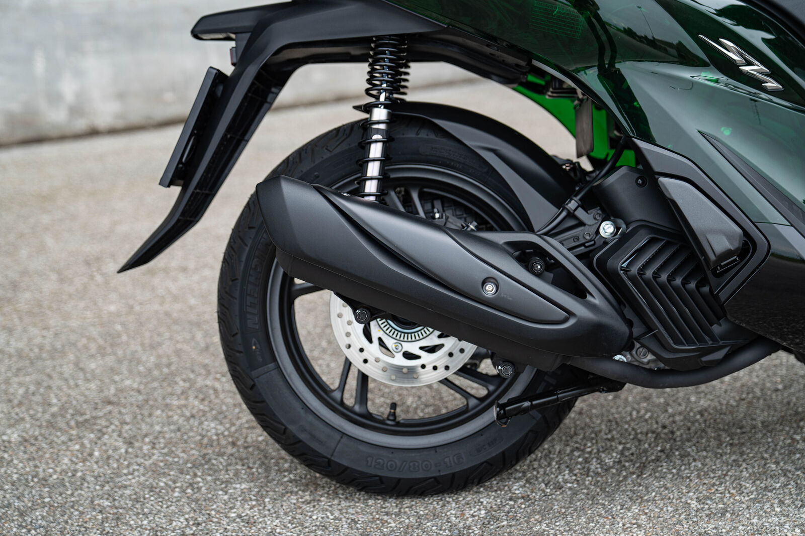 Willkommen im Walkaround! Der SH 125 hat definitiv Style. Die neue Sonderedition kommt mit einer durchsichtigen Optik, die einzigartig ist. Der Roller hat eine grüne Farbe, zwei Stereo-Federbeine hinten und eine Teleskopgabel vorne. Sowohl vorne als auch hinten sind 16-Zoll-Räder verbaut, die mit Michelin-Reifen bestückt sind. Die Optik des SH 125 ist wirklich einzigartig. Der Roller ist mit einem Keyless-Go-System ausgestattet, das den Tank und andere Funktionen elektronisch öffnet. Der Sitz ist groß genug für einen Helm und bietet viel Stauraum. In Österreich kommt der Roller serienmäßig mit einem Topcase. Weitere wichtige Features sind die Start-Stopp-Automatik und eine Traktionskontrolle, die sich auch ausschalten lässt. Der SH 125 ist mit ABS und Scheibenbremsen vorne und hinten ausgestattet. Die Sitzhöhe beträgt 799 mm und ist für alle Fahrergrößen geeignet. Die 16-Zoll-Räder sorgen für eine dynamische Fahrweise und schlucken auch Schlaglöcher problemlos. Der Funfaktor bei diesem Roller liegt in der dynamischen Abstimmung und nicht in der Motorleistung. Die 16-Zoll-Räder machen ihn wendig und spritzig, besonders in der Stadt.