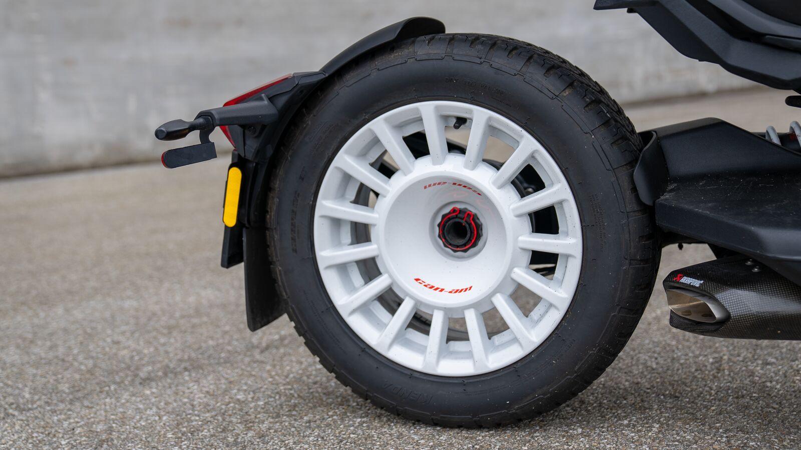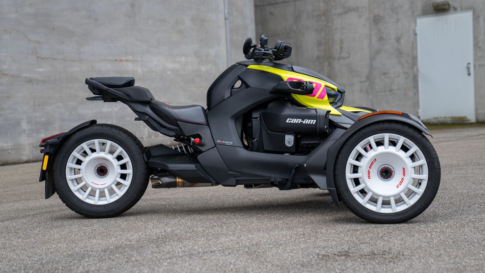 Platz genommen auf dem Ryker Rally, fällt sofort auf, dass er mit dem Autoführerschein gefahren werden darf – ein riesiger Vorteil für alle, die sich den Motorradführerschein sparen wollen. Die Bauform des Rykers ist einzigartig: zwei Vorderräder und ein Hinterrad bilden ein liegendes Y. Diese Konstruktion bringt einige fahrerische Vorteile, aber auch Nachteile mit sich. Beim schnellen Kurvenfahren kann es passieren, dass eines der beiden Vorderräder abhebt. Das kann zunächst beängstigend wirken, bietet aber auch die Möglichkeit, den Ryker in den Drift zu schicken – besonders im exklusiven Rally-Mode, den nur diese Version bietet.
