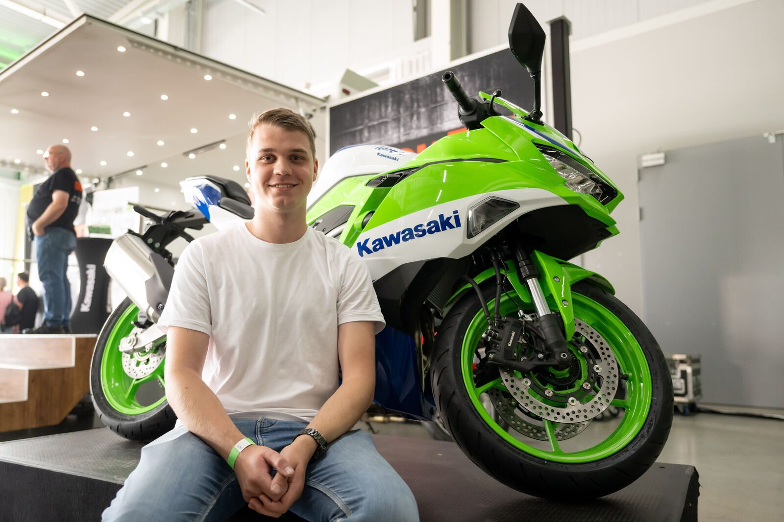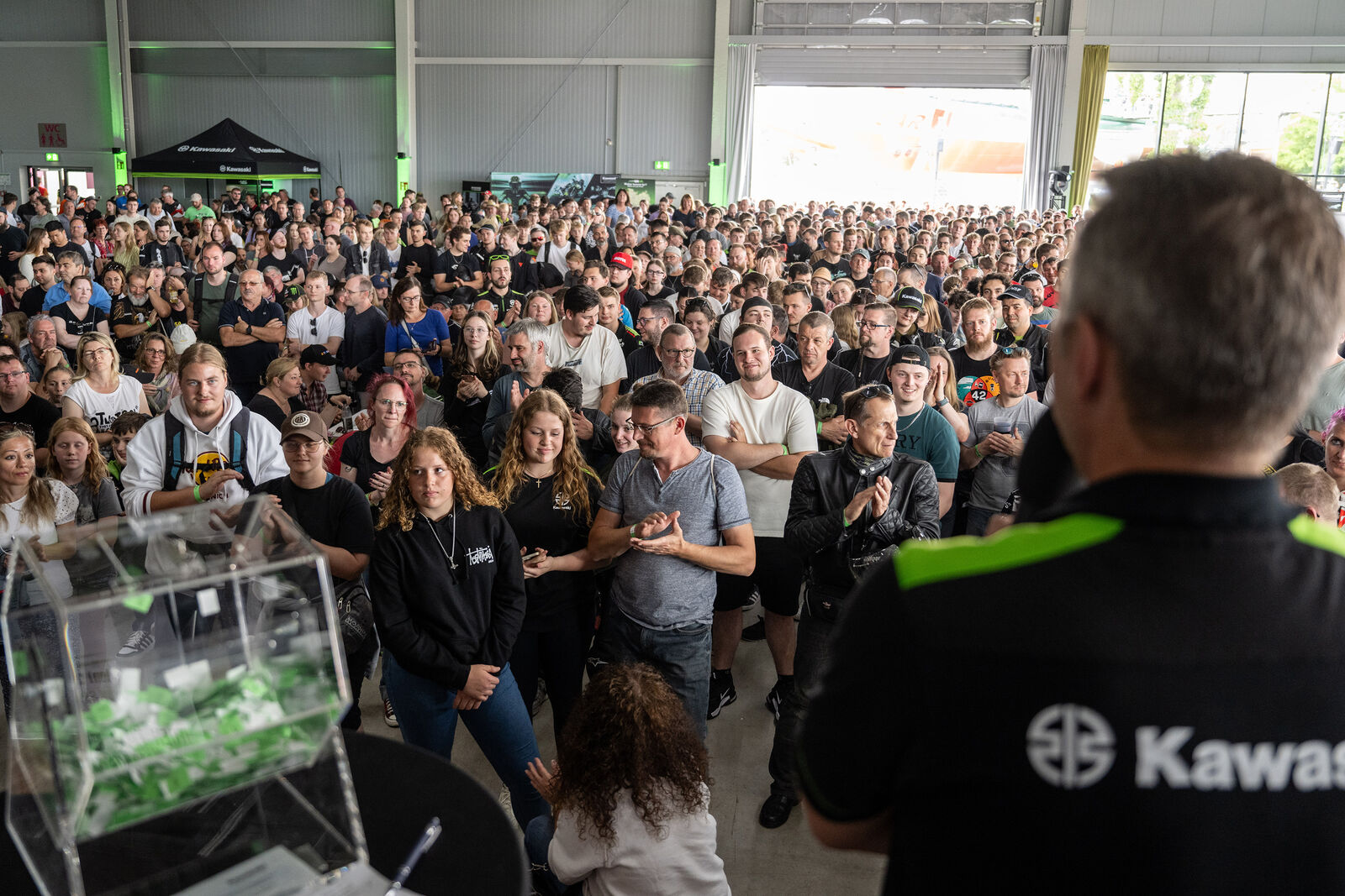 Das absolute Highlight an beiden Tagen stellte jedoch das große Gewinnspiel zum Ninja-Jubiläum dar. Jeder Besucher konnte sich kostenlos ein Teilnahmebändchen abholen. Die fortlaufende Nummer darauf wanderte gleichzeitig in den Lostopf, und jeweils nachmittags fand dann der große Showdown statt. Der Hangar war an beiden Tagen zur Ziehung bis zum letzten Platz gefüllt, und die Spannung war mit Händen greifbar. Am Samstag konnte Marc-Alexander aus Biblis mit seinem Sohn Silas die Ninja 650 in der rot-schwarzen Jubiläumslackierung mitnehmen. Am Sonntag gewann Jascha aus Otzberg pünktlich zu seinem 20. Geburtstag die Ninja ZX-4RR im wunderschönen 40th-Anniversary-Outfit.