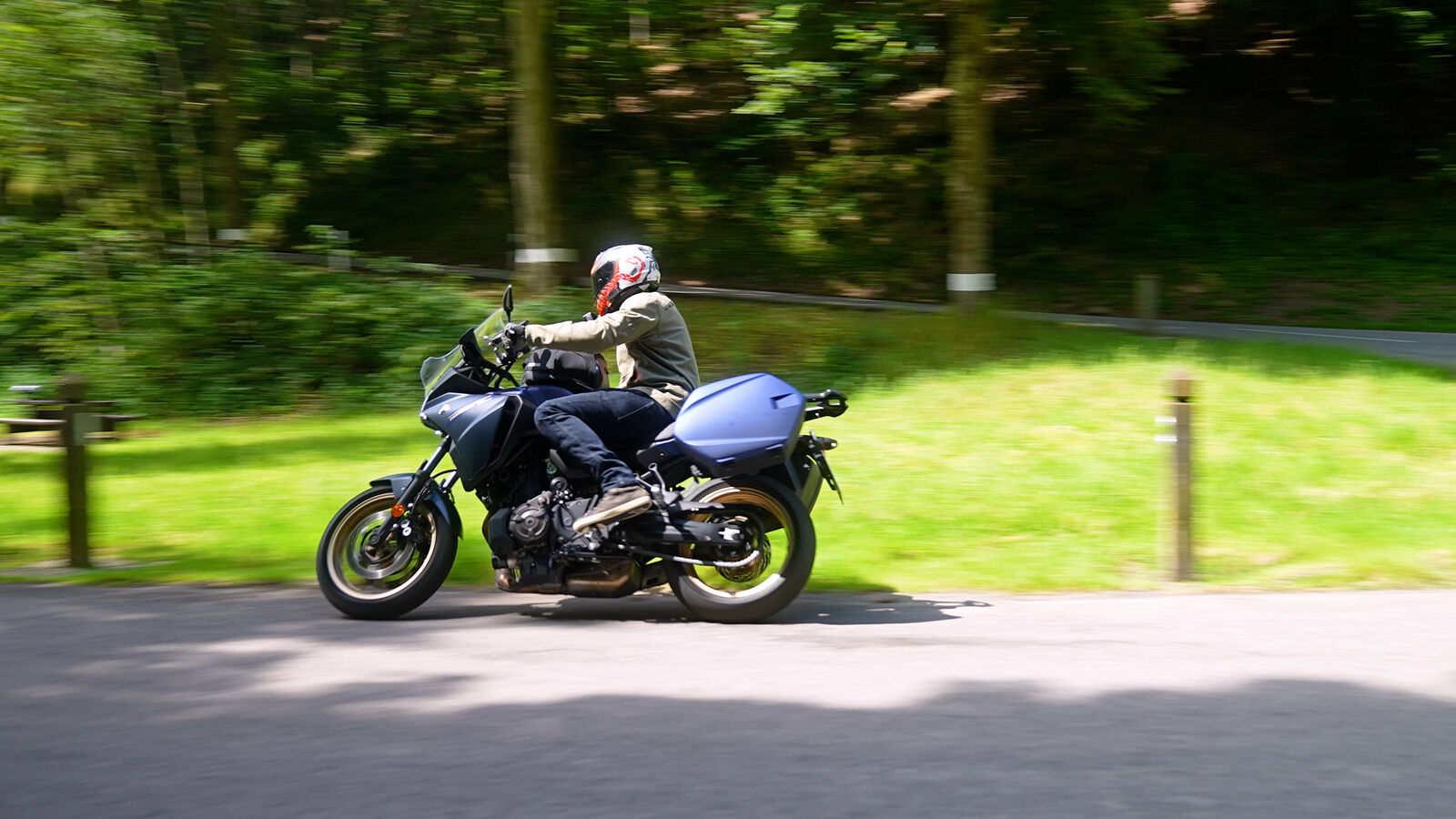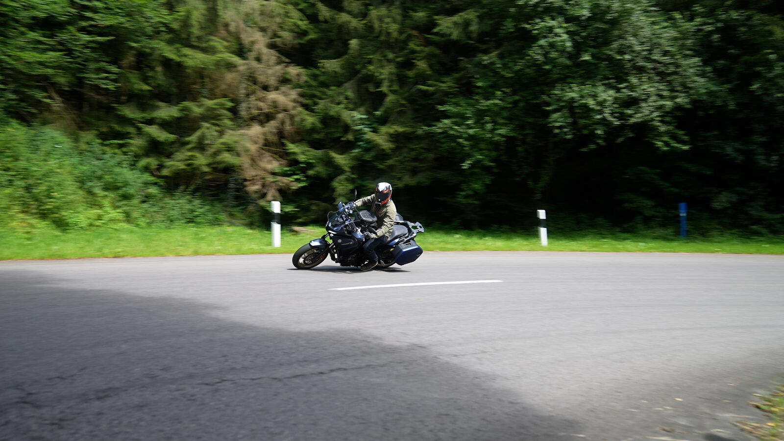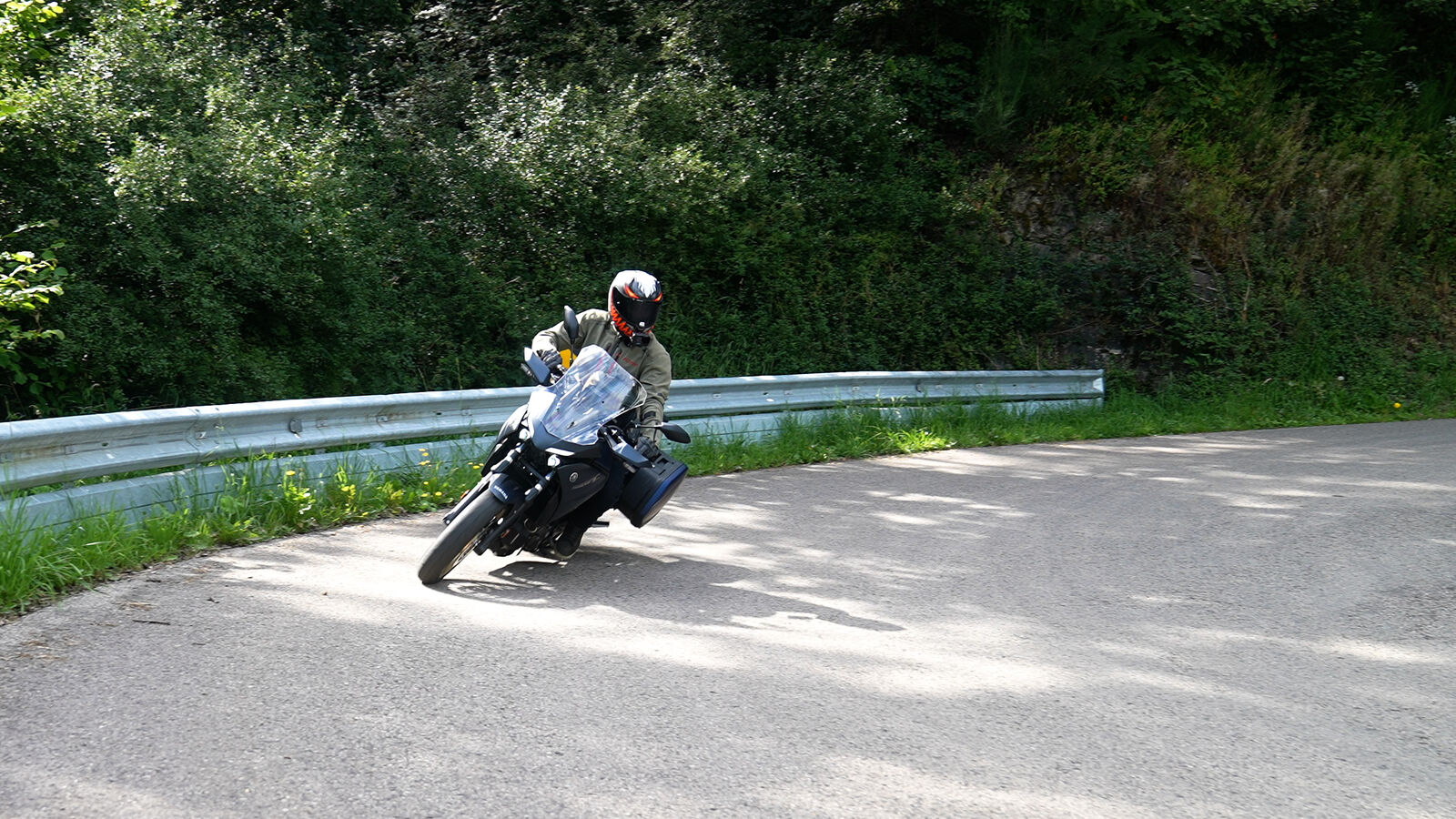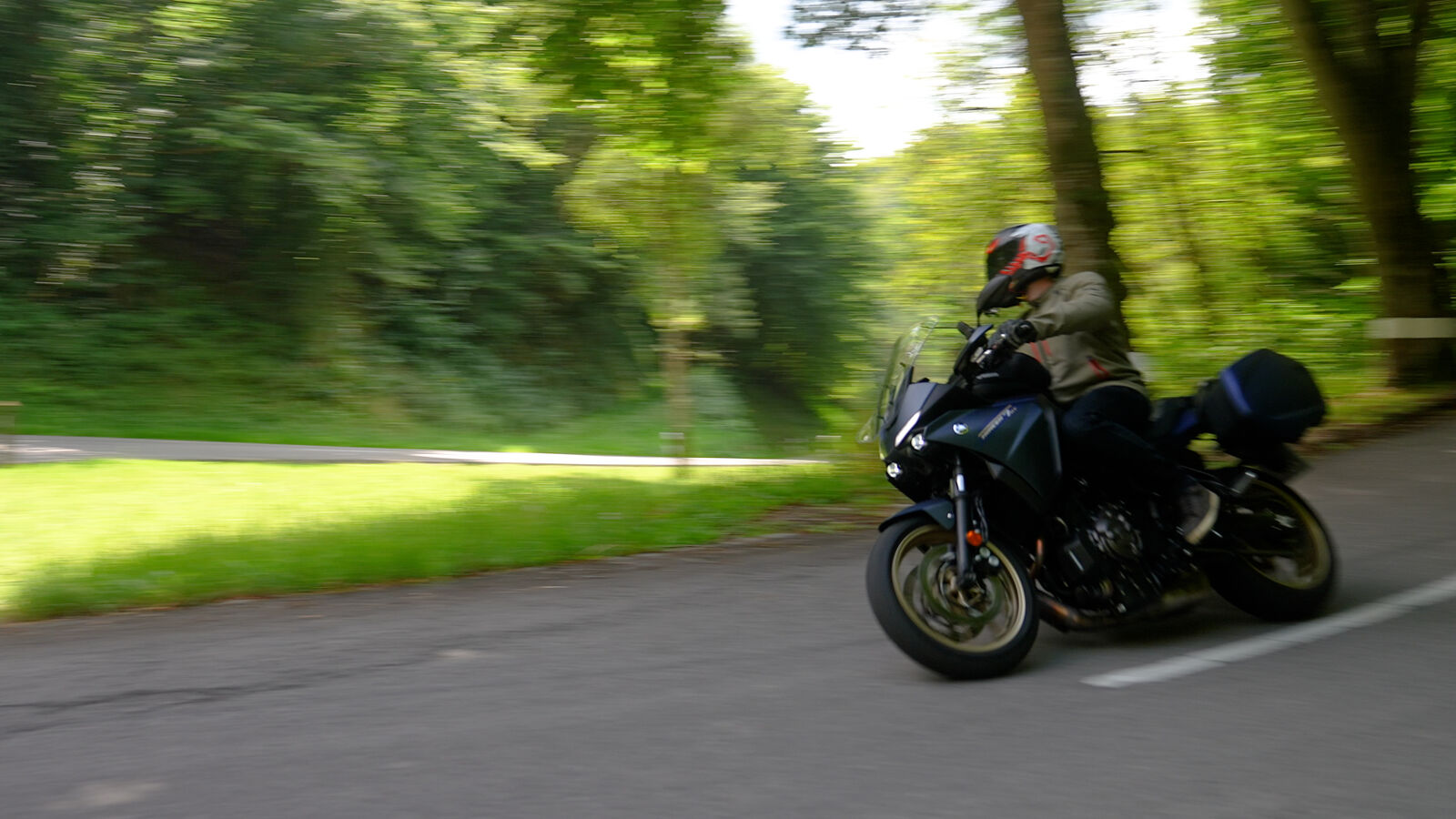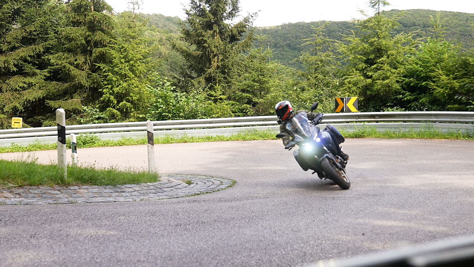 Kommen wir nun zur rechtsseitigen Spitzkehre, die für viele Biker der absolute Horror-Moment ist. Du siehst die Kurve und hast das Gefühl, dass dir ein LKW entgegenkommt, doch du siehst nichts. Hier ist es wichtig, ruhig zu bleiben. Du fährst zunächst kerzengerade auf die Kurve zu und beobachtest den Verkehr. Wenn du sicher bist, dass kein Gegenverkehr kommt, kannst du dich auf die Kurve konzentrieren. Achte darauf, dass du nicht einfach in die Mitte der Fahrbahn fährst, denn das könnte gefährlich werden. Dein Ziel ist es, an der Innenseite der Kurve herauszukommen. Wenn du das schaffst, bist du auf der sicheren Seite! Die Technik bleibt gleich: Du fährst außen an, lenkst ein und kommst an der Innenseite wieder raus. Wichtig ist, dass du beim Einlenken auch die Bremsen richtig nutzt. Die Kombination aus Vorder- und Hinterradbremse sorgt dafür, dass du optimal in der Kurve bleibst und nicht das Gefühl hast, die Kontrolle zu verlieren.