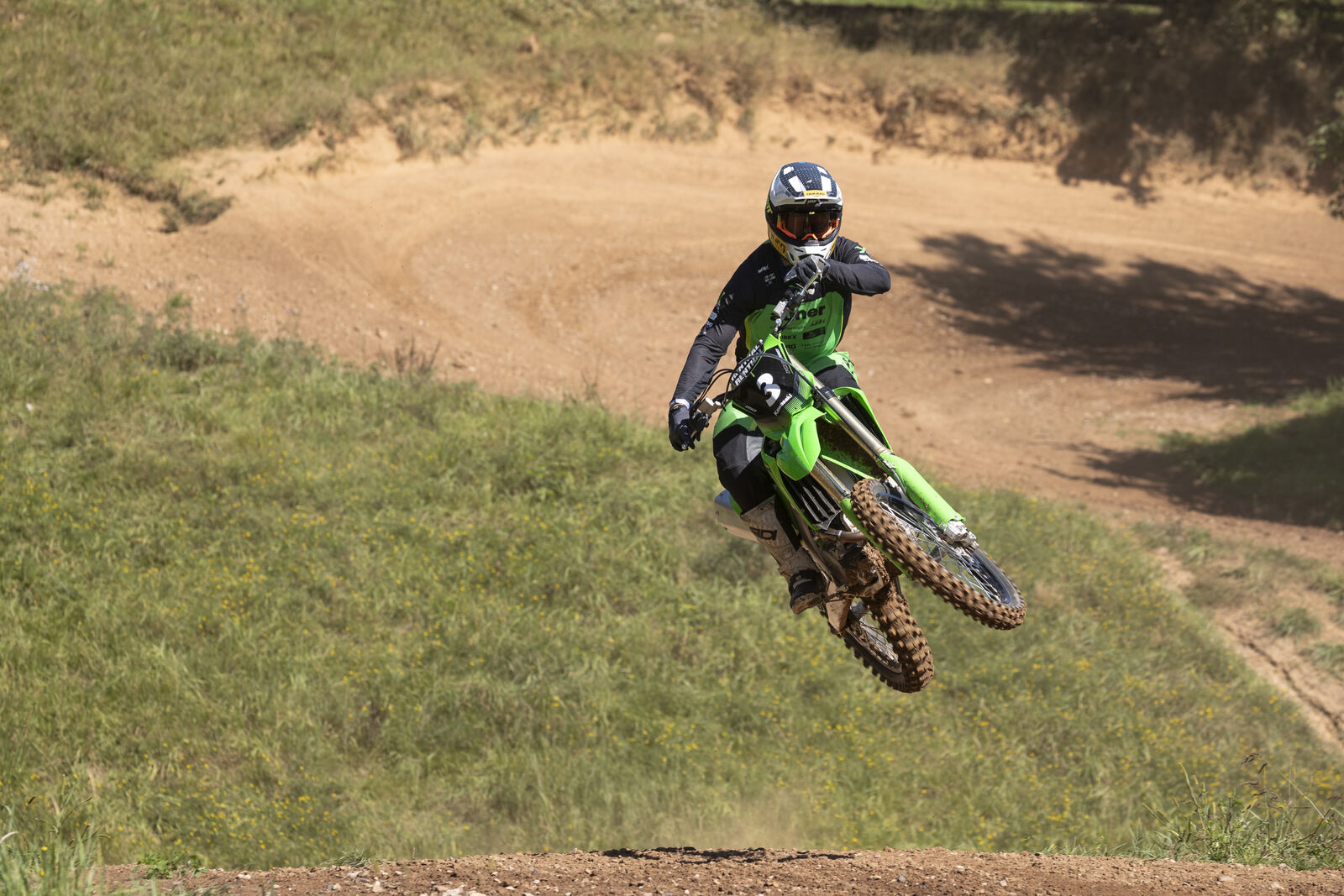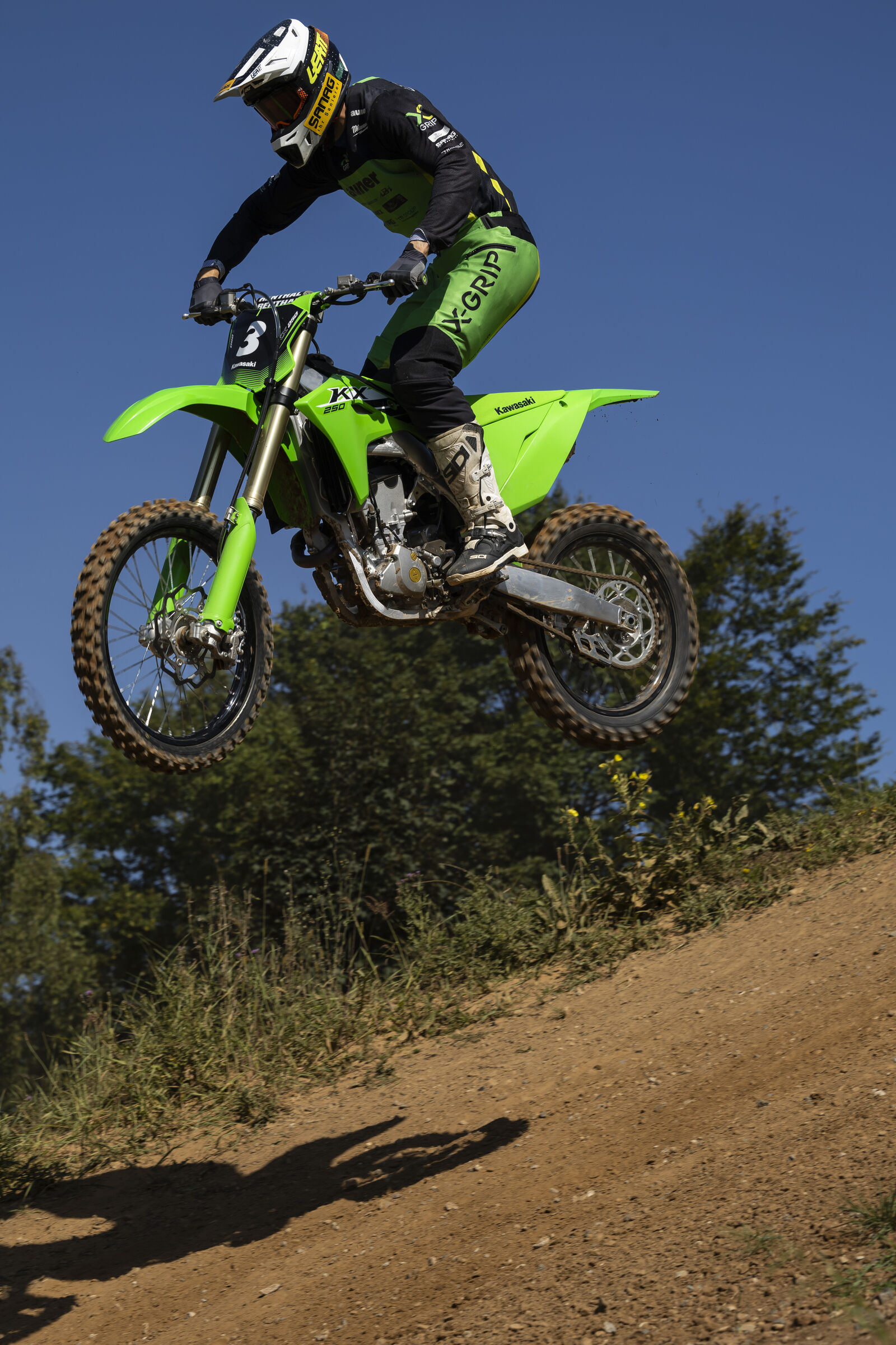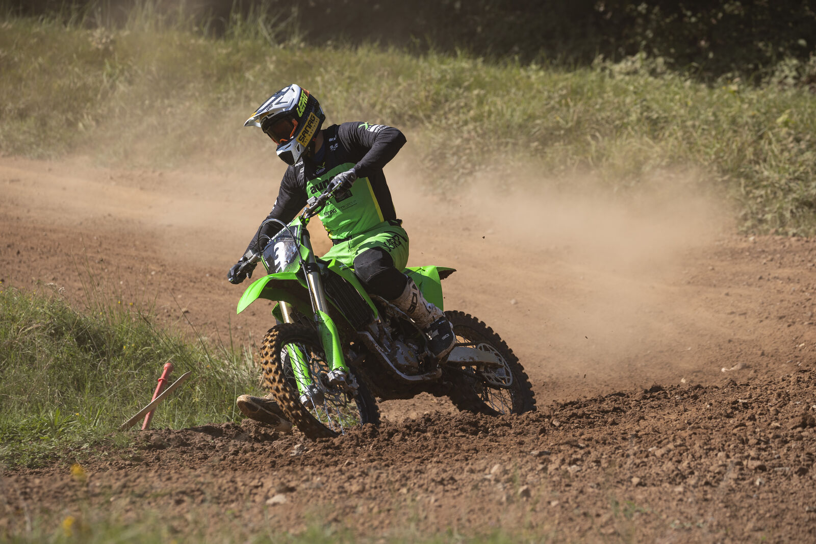 Das Fahrverhalten der KX250F ist einfach beeindruckend. Mit vier Sessions auf einer trockenen Hartstrecke konnte ich die Kraft des Motors und die Stabilität des Rahmens ausgiebig testen. Die Gabel lässt sich leicht anpassen, was dir ermöglicht, den Schwerpunkt nach deinen Vorlieben zu justieren. Ein kleiner Tipp: Wenn du den Gabeldurchschritt um ein paar Millimeter erhöhst, verbessert sich das Kurvenverhalten erheblich.