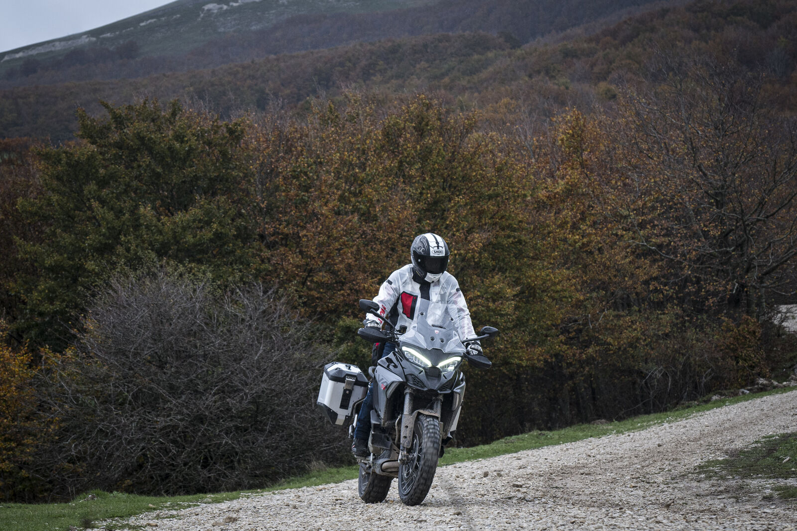 Kommen wir zum Fahrwerk, das bei der neuen Multistrada ebenfalls beeindruckt. Die bewährte Mazzocchi-Gabel vorne und hinten sorgt für eine stabile und komfortable Fahrt. Neu ist ein Sensor zur Stoßerkennung in der Gabel, der die Federung in Echtzeit anpasst. Das bedeutet, du kannst über Unebenheiten fahren, ohne aus dem Sitz gehoben zu werden. Ein echtes Highlight für Offroad-Fans! Zudem senkt sich die Multistrada unter 10 km/h automatisch, was besonders für kleinere Fahrer einen Sicherheitsvorteil darstellt. Auch die neuen geschmiedeten Alugussfelgen sind ein echter Gewinn für das Handling, da sie um 2 kg leichter sind als die Vorgängerversion.