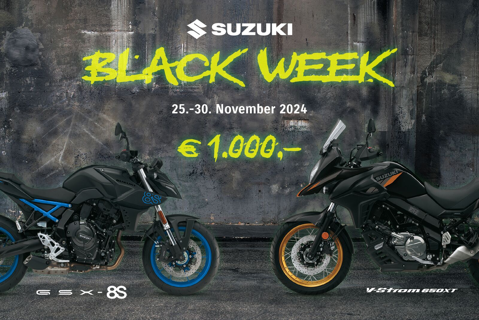 Vom 25. bis zum 30. November 2024 bietet Suzuki mit der „Black Week“ in Österreich ein besonderes Verkaufs-Event an. Während dieses sechs Tage dauernden Zeitraums erhalten Kunden 1.000 Euro Rabatt auf die Modelle GSX-8S und V-STROM 650/XT. Die Aktion findet bei teilnehmenden Suzuki-Motorrad-Partnern statt und ist mit attraktiven Finanzierungsoptionen kombinierbar. Die Suzuki Black Week stellt damit eine exklusive Gelegenheit dar, ausgewählte Suzuki-Modelle zu Sonderkonditionen zu erwerben.